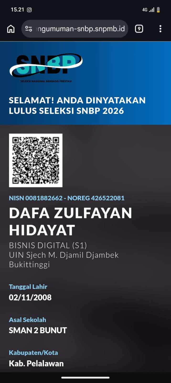 "Selamat dan sukses kepada Dafa Zulfayan atas kelulusannya di UIN Sjech M. Djamil Djambek Bukittinggi melalui jalur SNBP 2026. Pencapaian ini ada...